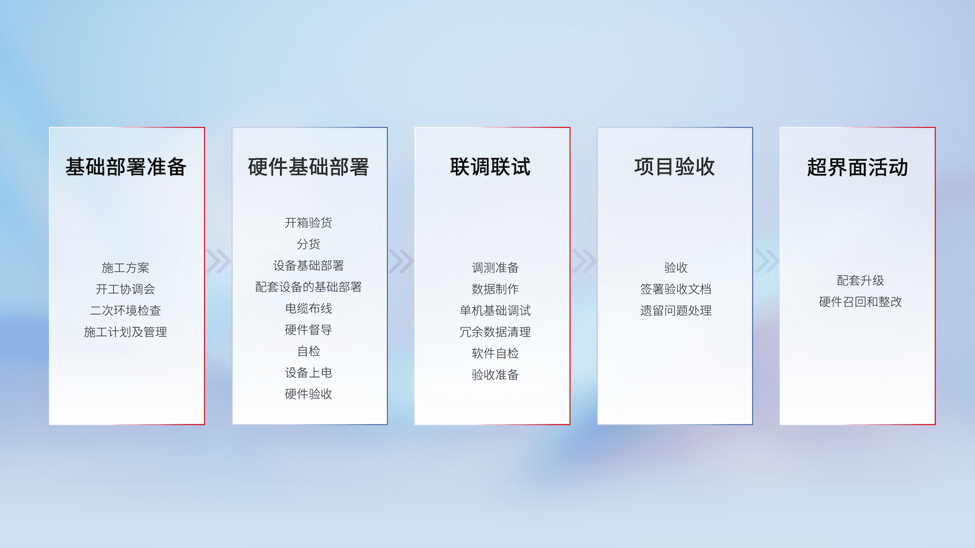 从基础部署准备、、、硬件基础部署、、联调联试、、、项目验收、、越界面活动的全过程可追溯,,,,保证施工质量和进度。。。
